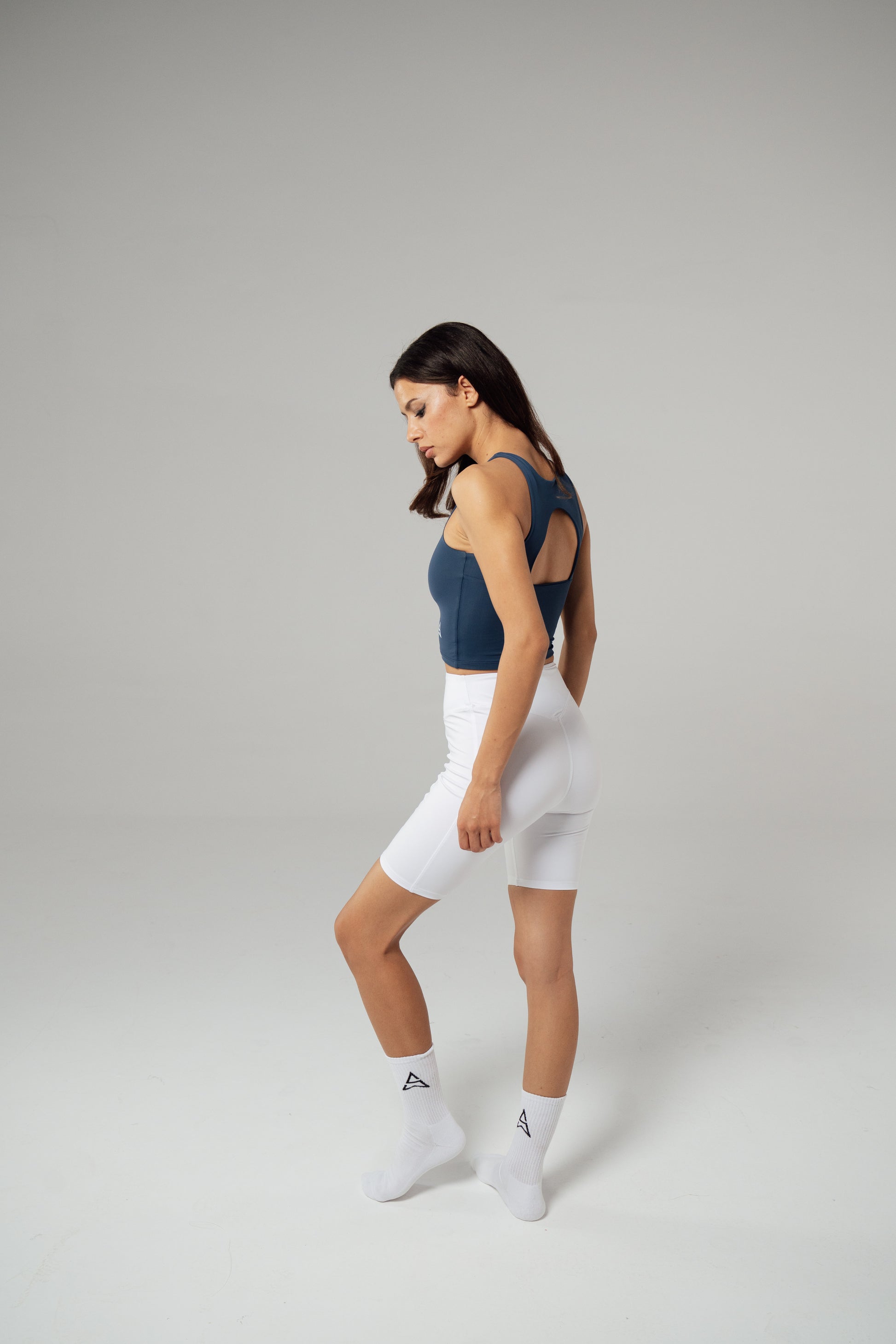 Short cycliste taille haute. Tissu gainant, confortable et anti-transpirant, équipé d'une poche latérale fonctionnelle. Idéal pour le running, le yoga ou la salle de sport.
