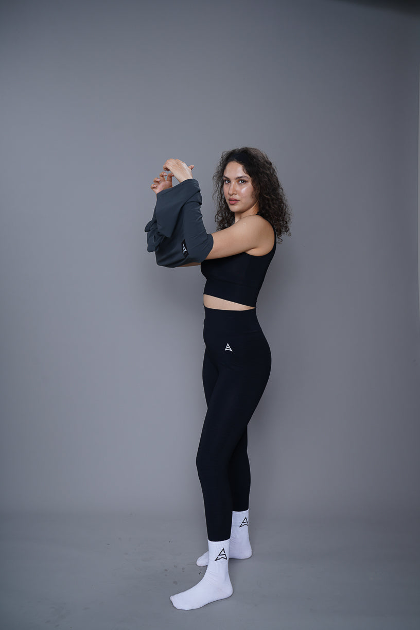 Cette tenue se compose de trois pièces essentielles : un top moderne et confortable, un legging ajusté qui épouse parfaitement la silhouette, et un pull-over size de taille généreuse pour une touche de confort supplémentaire. Conçue pour allier praticité et style, cette tenue offre une liberté de mouvement idéale tout en restant élégante et avec chaussette gratuit.